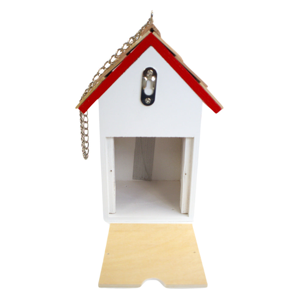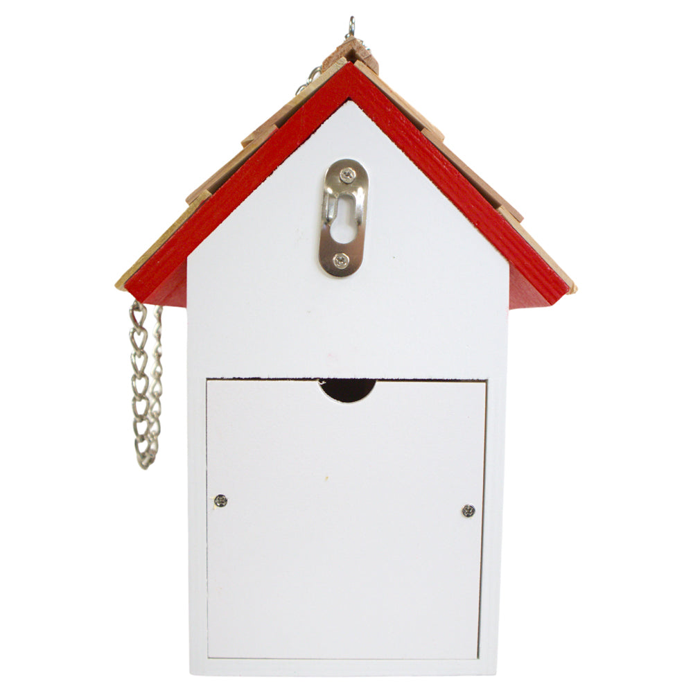 - This fully functional birdhouse includes a removable back wall for easy annual cleaning and has a sturdy galvanized metal chain for hanging.
