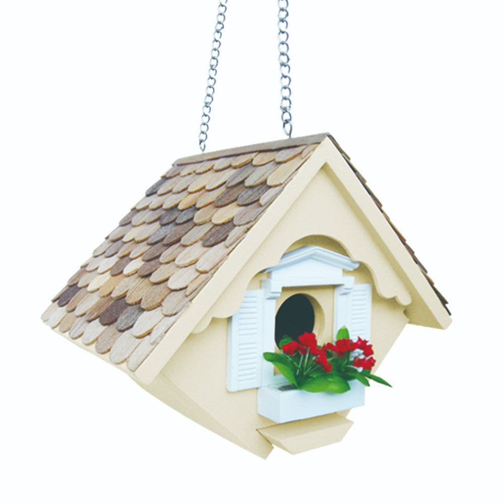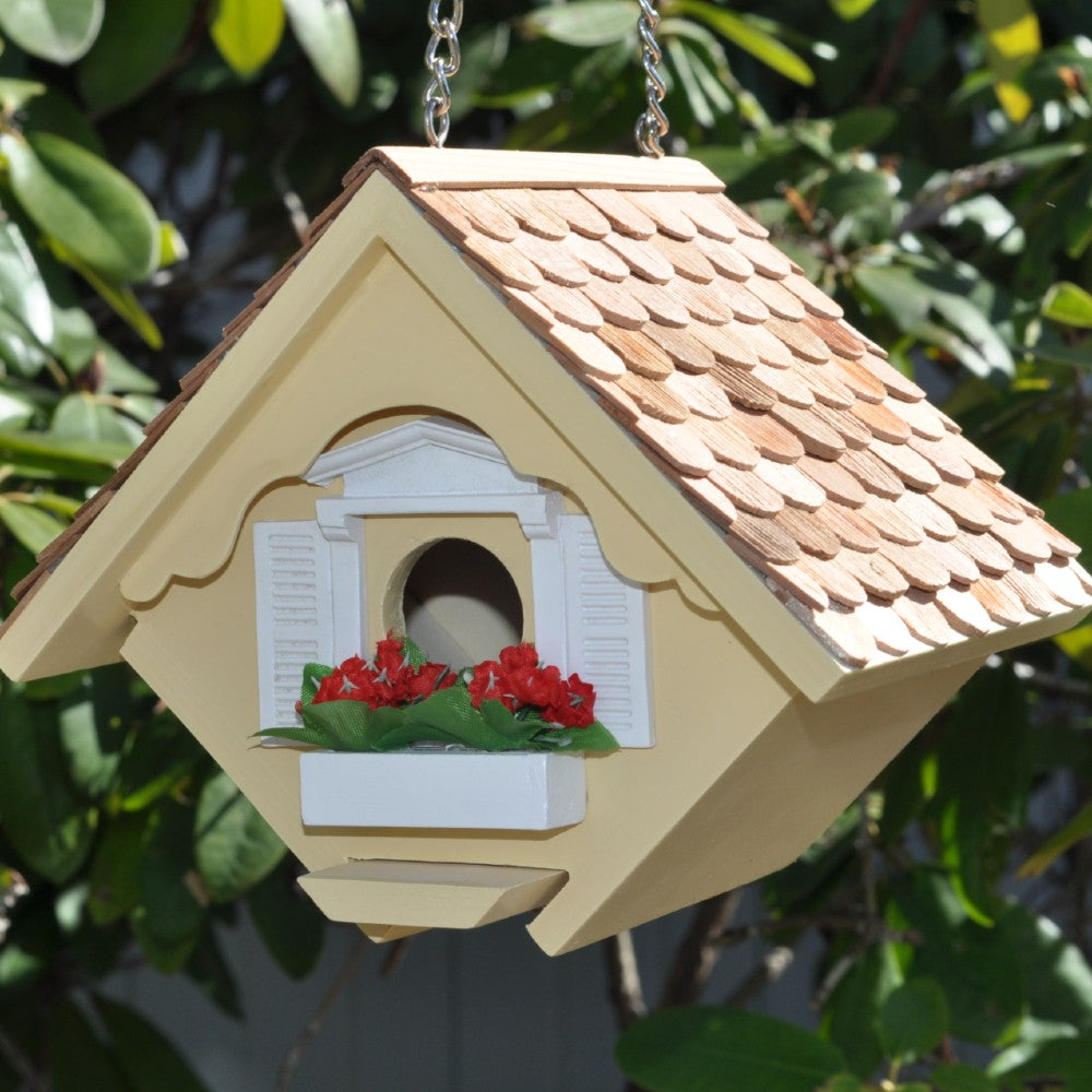 • This Little Wren in yellow is a hanging house designed to accommodate house wrens, one of the only species that enjoy a swinging nest box.
