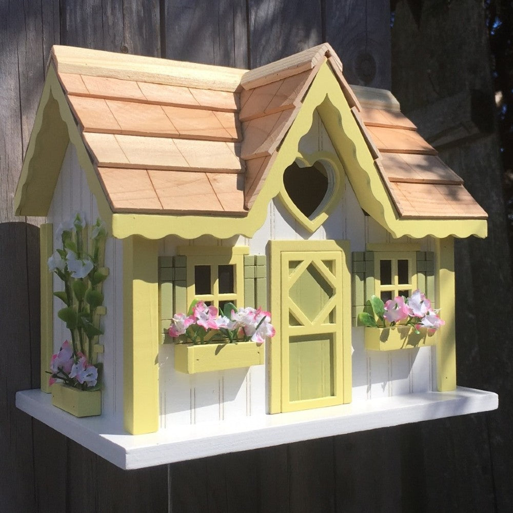 • The heart-shaped entry hole will allow small nesting birds in and keep out larger unwanted predators. White body, yellow and green contrasting paint trim, with window flower boxes filled with pink buds. Sweet, Tweet!