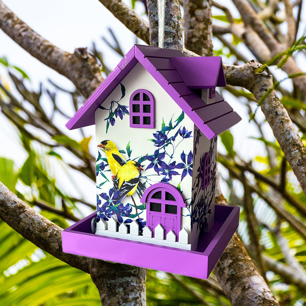 - The front features an adorable picket fence trim and is beautifully decorated with a charming print of goldfinches and clematis.