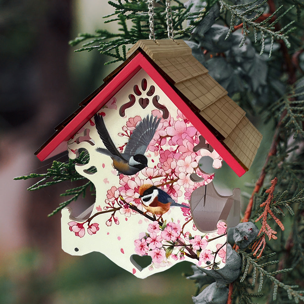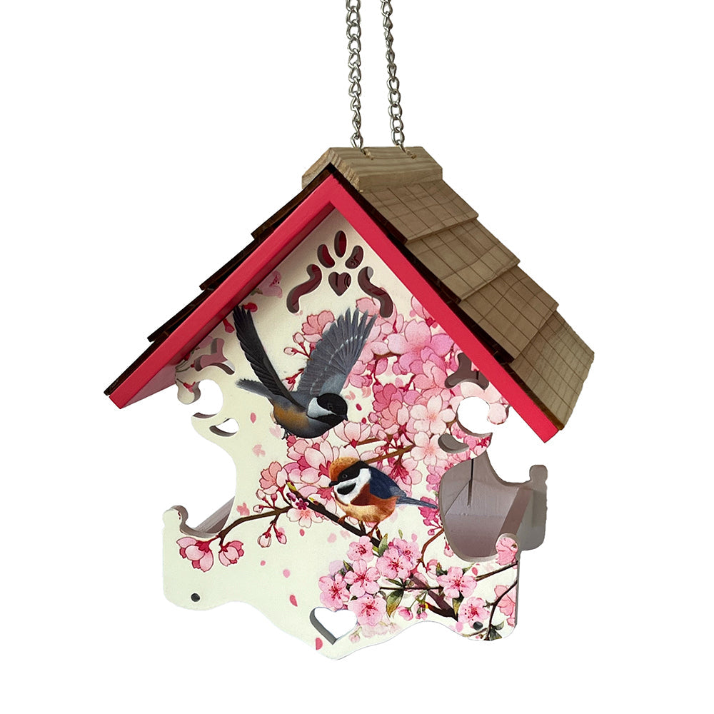 • This beautiful hanging Love Nest Feeder is designed to attract wild birds, featuring an enchanting print of chickadees and cherry blossoms.